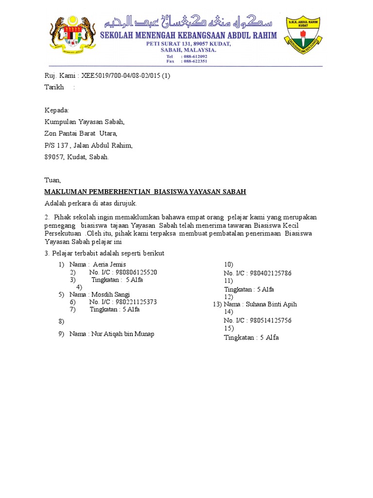 Surat Penarikan Biasiswa Yayasan Sabah 014 Pdf